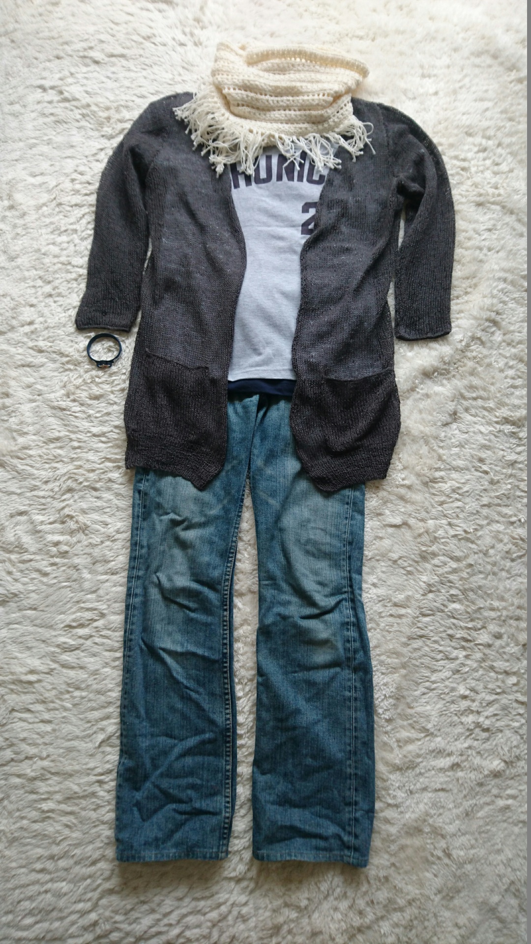 ビジターは屋外が多いのでかなり前に編んだフリンジつきのスヌードをプラスして~