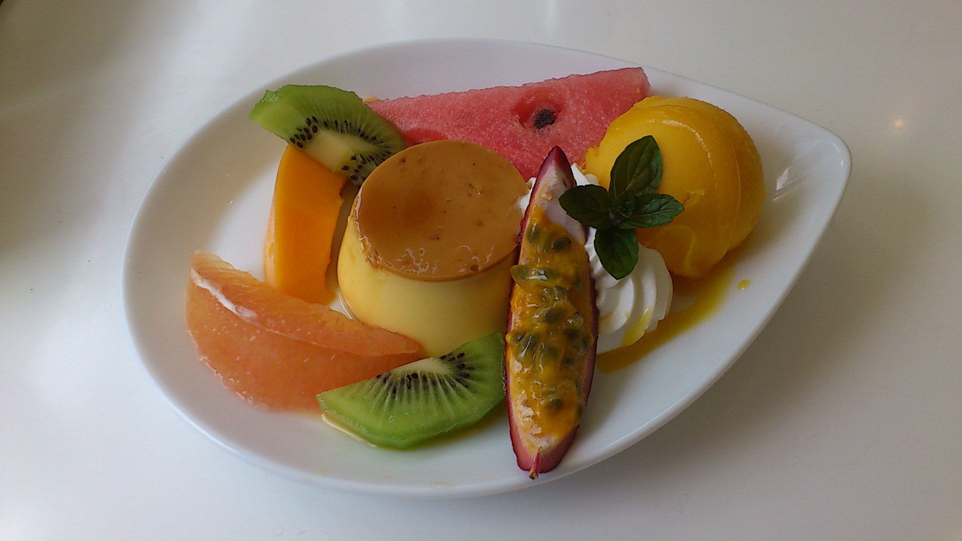 なお、ホットケーキが登場するや否や、近くの席のちびっ子がホットケーキジロジロ見てて恥ずかすぃ~(/ω\*キウイとパパイヤ、そしてマンゴーのシャーベットと